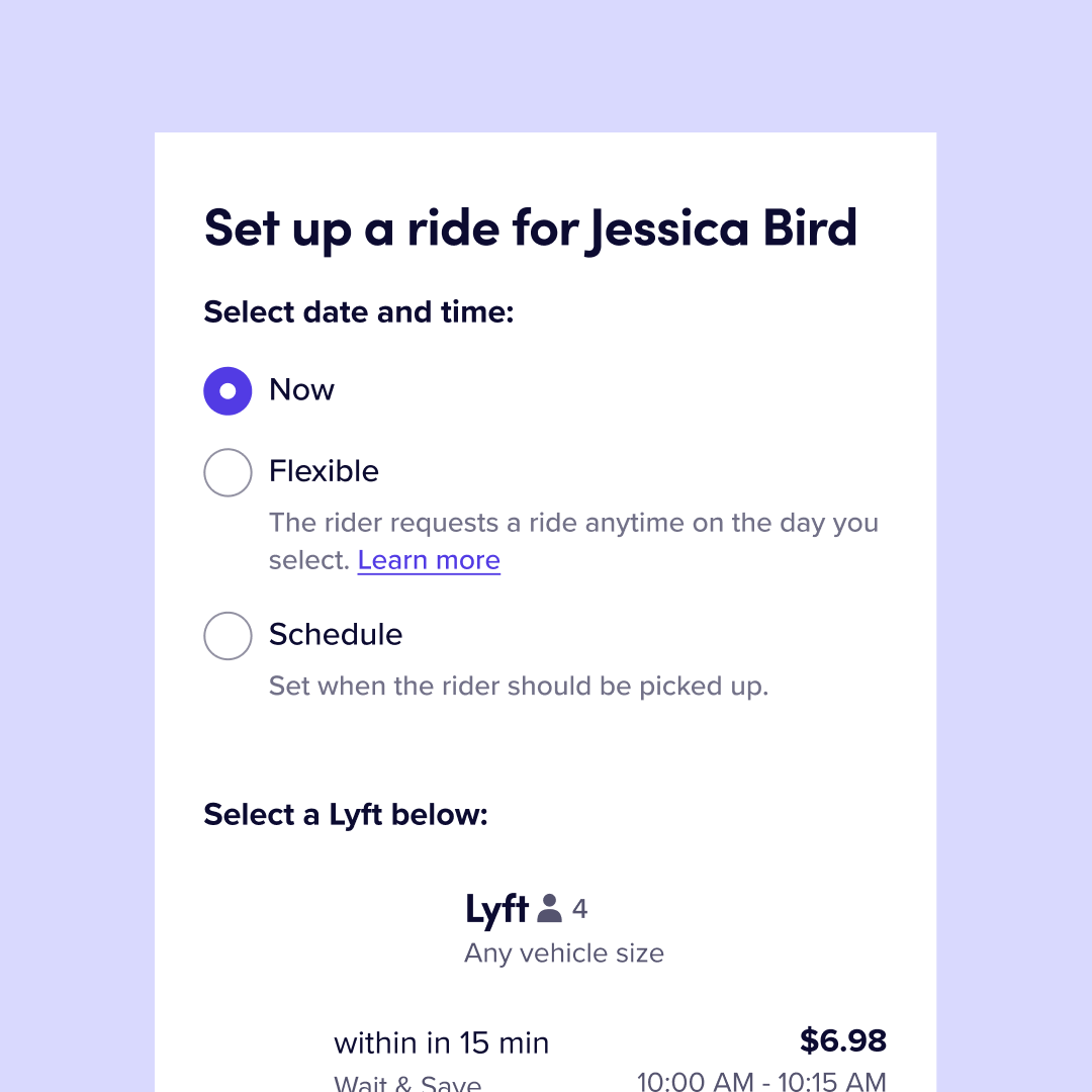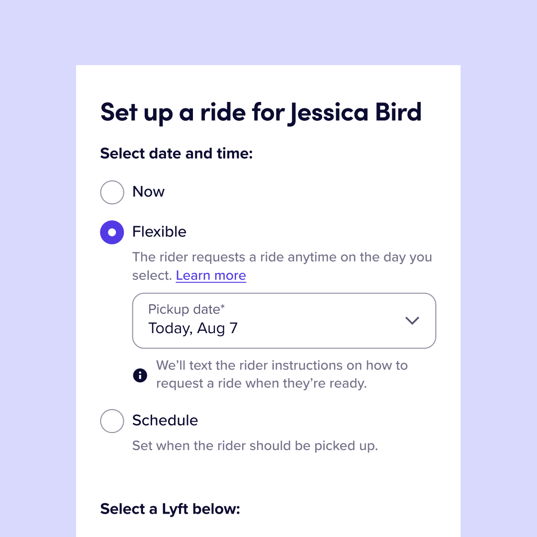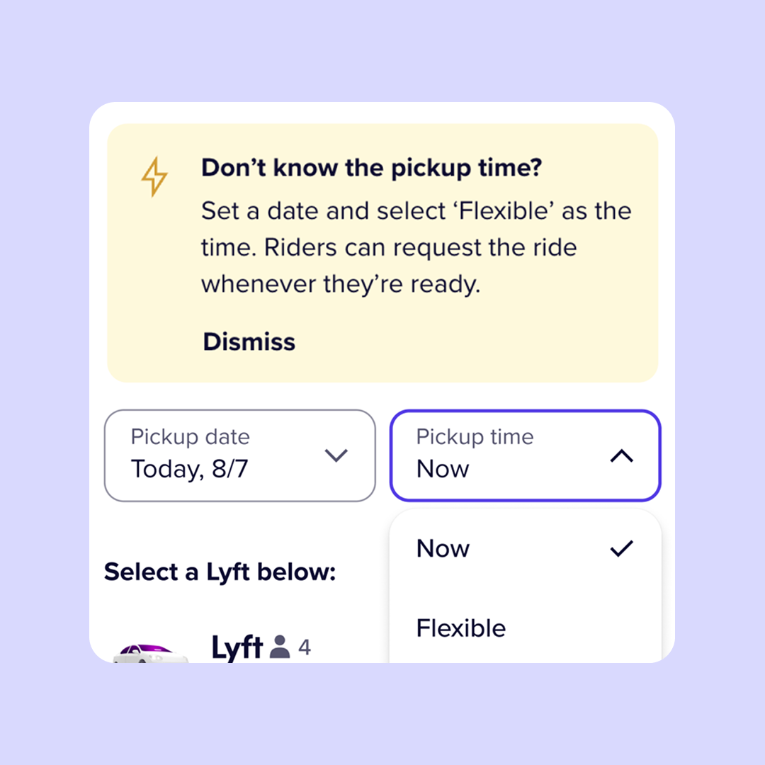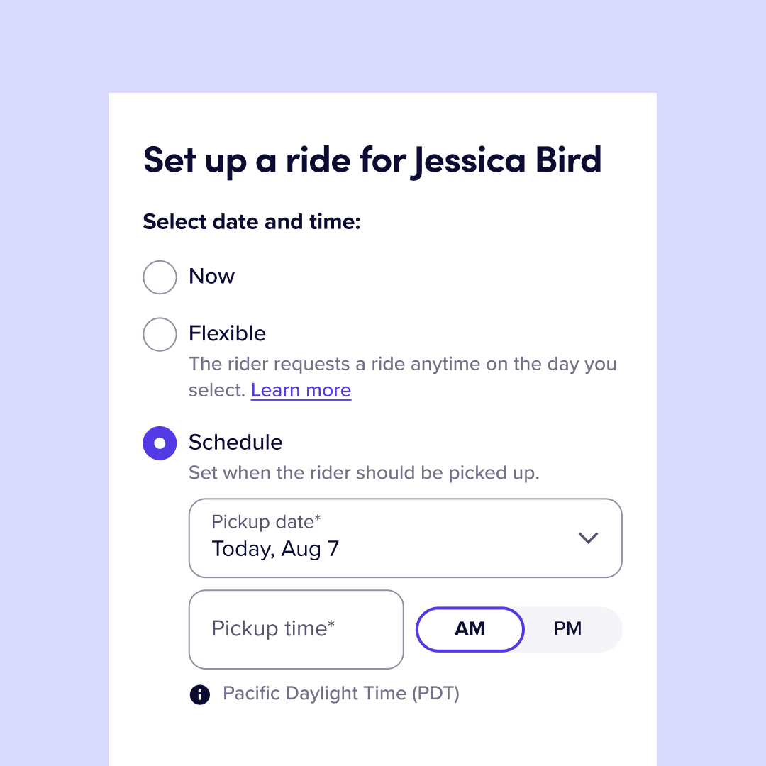 My work centered on how coordinators choose timing, understand and select ride options, and specify pickup locations, ensuring these high-impact moments in the flow were clear, flexible, and error-resistant. Specifically, I: