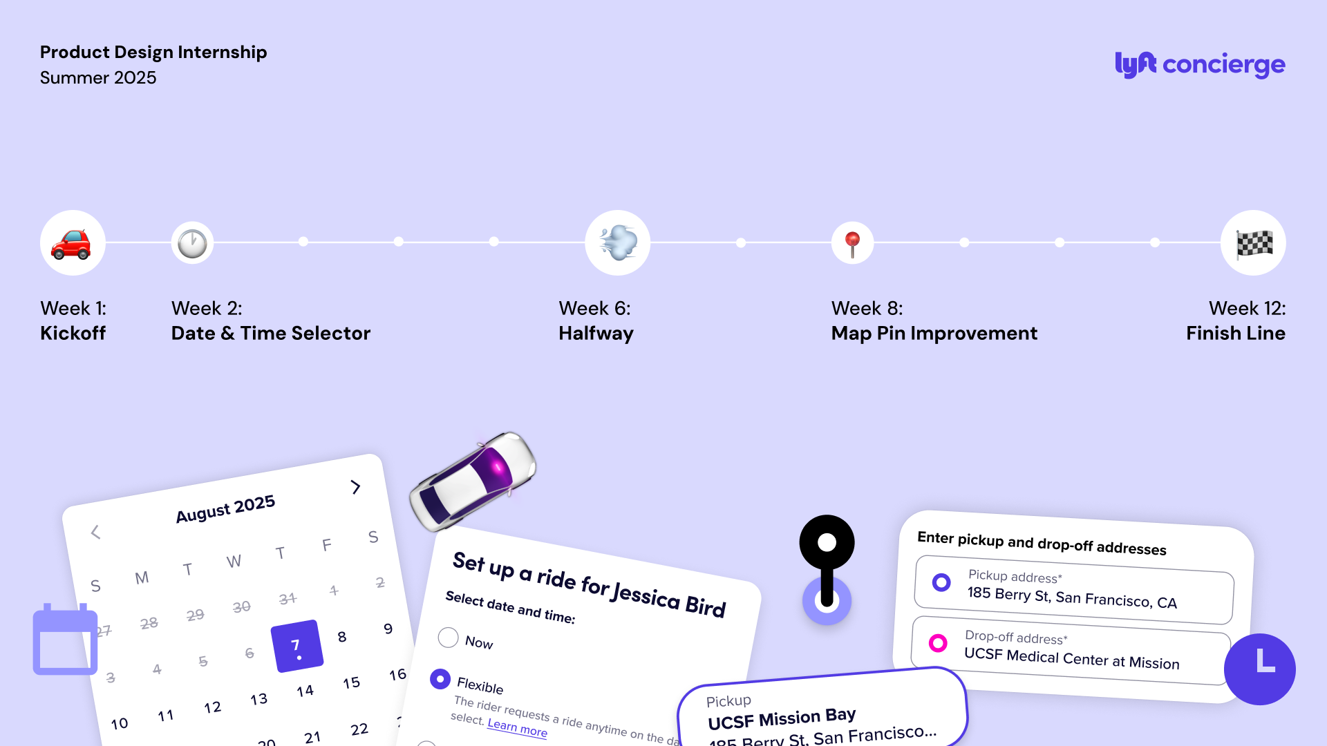 Booking a ride sounds simple — until you're doing it on behalf of someone else, for a specific appointment window, for a rider who may not even have a smartphone. Lyft Concierge is built for exactly this: healthcare facilities, automotive organizations, and other companies that coordinate transportation for the people they serve. As a product design intern at Lyft, I spent twelve weeks reducing friction in the Concierge web booking flow, making it faster, clearer, and less prone to error.